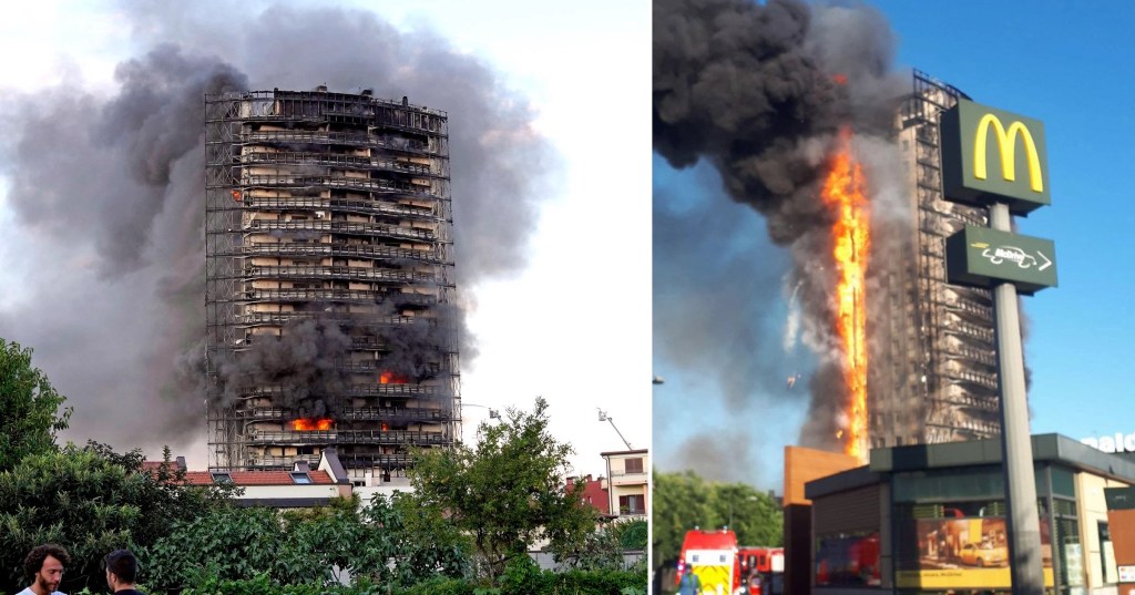 Never in the history of humanity (or since 9/11) has a skyscraper collapsed due to fires, but on that faithful day it happened 3 times. Sure. Here’s a building in Milan that went up in flames just recently. Didn’t collapse though.